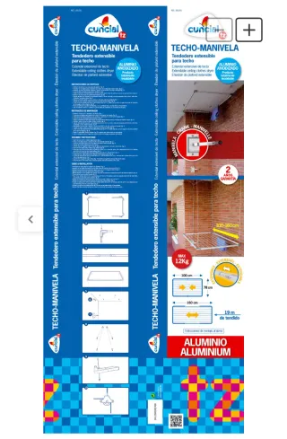 Tendedero extensible para techo Cuncial, modelo Manivela. Viene sin abrir y listo para instalar. Lo vendo porque he comprado otro y perdí el ticket de Leroy Merlín - Capacidad de carga máxima de 12 kg. - Dimensiones extendido: 100-160 cm. - Longitud de tendido: 19 m. - Fabricado en aluminio anodizado.
