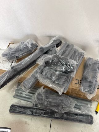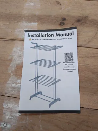 Tendedero vertical de tres niveles, ideal para optimizar el espacio en tu hogar. Su diseño plegable facilita su almacenamiento cuando no está en uso. - Estructura principal de metal. - Conectores y bases de plástico. - Hay un defecto, una rueda está rota.