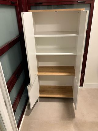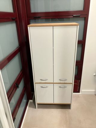 Mueble de almacenaje con un diseño moderno y funcional. Medidas: 136,5x61x28,5cm (altura x anchura x profundidad). Combinación de colores blanco y madera. En muy buen estado. Lo vendemos por cambio de mobiliario en toda la cocina. Sirve como mueble auxiliar de baño o almacenaje en zona de tendedero.