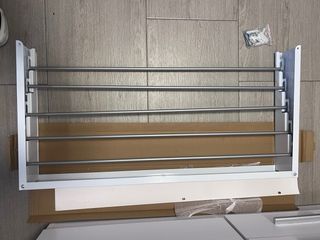 Tengo a la venta este tendedero de pared. Es plegable y ocupa poco espacio. - Medidas: 100cm de ancho x 40cm de fondo. - Capacidad máxima de carga: 27 kg. - Incluye dos barras de 100cm para la pared.