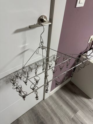 Tendedero metálico con un diseño práctico para colgar ropa. Se “plega” y no ocupa prscticamente nada, muy util para ahorrar espacio y secar la ropa rapidamente - Incluye 40 pinzas. - Cuenta con una percha para colgarlo fácilmente de tu tendedor o puerta Hago precio si te llevas mas articulos de mi perfil, gracias, un saludo