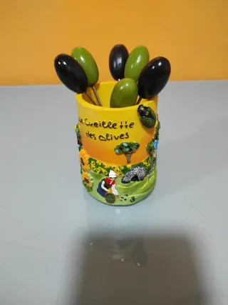 Original recipiente decorado con escenas de la recolección de aceitunas, ideal para servir tenedores. - Diseño con escena de recolección. - Incluye varios tenedores con forma de aceituna.