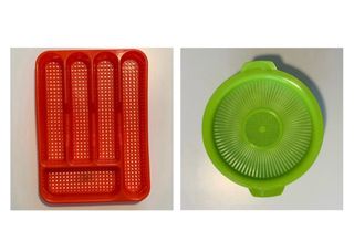 inserto con 3 huecos para cuchillos, tenedores y cucharas de 24x4,5cm cada uno, un hueco grande para cuchillos grandes y utensilios varios, de 32,4,5cm y un último más pequeño para cucharillas de postre, de 7x17cm. Las medidas exteriores son 34x25x4,5cm de altura. Escurridor verde de 25cm de diámetro, 27cm en la zona de las asas y 10cm de altura. PRECIO CONJUNTO