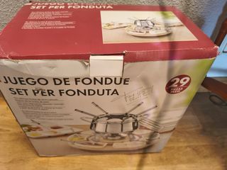 Juego de fondue completo y en perfecto estado. Ideal para disfrutar de veladas especiales con amigos y familiares. - Incluye 29 piezas. - Recipiente para fondue. - 6 tenedores para fondue. - Plato giratorio de madera. - Bandejas para salsas.