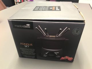 Masterclass fondue set nueva con 6 tenedores.Aún con su caja, plásticos e instrucciones. Recipiente de hierro fundido esmaltado. Incluye olla de hierro fundido, quemador, base y 6 tenedores cada uno con un color diferente. El quemador usa combustible en gel o alcohol. Mide unos 12 x 18 x 21 cm. Todo el conjunto pesa casi 4 kilos.
