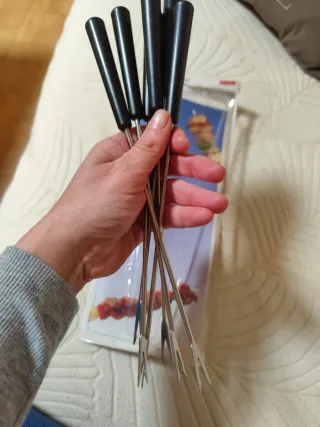 Nuevos sin uso. Set de seis tenedores para fondue, perfectos para compartir. Mangos de plástico negro con colores para diferenciarlo. De acero inoxidable.