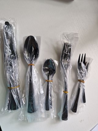 Juego de cubiertos de color negro elegante y moderno. - Incluye 1 cuchillo, 2 cucharas y 2 tenedores. - Material: acero inoxidable. - Piezas en perfecto estado.