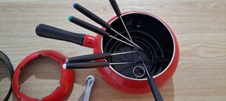 Fondue para 6 personas. Cuerpo y soporte de hierro fundido. Quemador de alcohol, 6 tenedores (regalos otros 2). En buen estado. Usada unas 5 o 6 veces. Las marcas que puedes tener es por la Antigüedad más de 20 años. La caja del contenido está un poco dañada. Una excelente oportunidad para adquirir un producto que nos permite disfrutar de buenas veladas con la familia y/o amigos