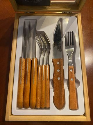 Juego de cubiertos de madera y metal, en perfecto estado. Incluye 6 cuchillos y 6 tenedores. Están en una caja de madera, ideal para guardarlos y transportarlos. Son elegantes y resistentes.
