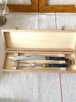 Conjunto de trinchar vintage francés de la marca Grissolange Pouzet, compuesto por cuchillo y tenedor con mangos decorativos tipo baquelita o cuerno, y hoja de acero inoxidable. Ideal para decoración de cocina, coleccionistas o uso ocasional en cenas especiales. El estuche original está incluido (presenta manchas visibles por el paso del tiempo, como se ve en las fotos). 🗂 Estado general: bien conservado, con señales normales de uso y antigüedad. Medidas aproximadas: • Cuchillo: 32,5 cm • Tenedor: 27,5 cm cuberteríaVintage menajeAntiguo cubiertos