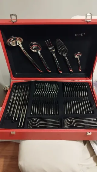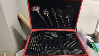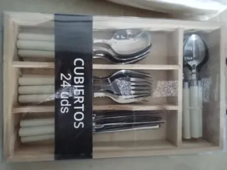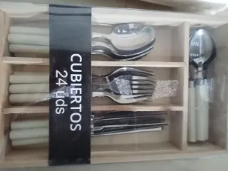 Leer toda la descripción. Cuento con las siguientes piezas: 8 cucharas grandes (5 sin abrir, una sin usar, 2 usadas). 8 tenedores (5 sin abrir, uno sin usar, 2 usados) 7 cuchillos (uno abierto). 14 cucharas pequeñas (los plásticos están grapados y un plástico tiene 2 cucharas). 7 cucharas medianas (una suelta, las demás con plástico grapado). 2 mini cucharones (uno abierto, otro sin abrir). Precio: -Conjunto compuesto por media docena de cubiertos de cada tipo y los 2 mini cucharones: 60€. -Resto de cubiertos sueltos: 3€ unidad.