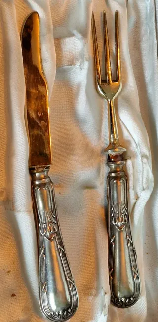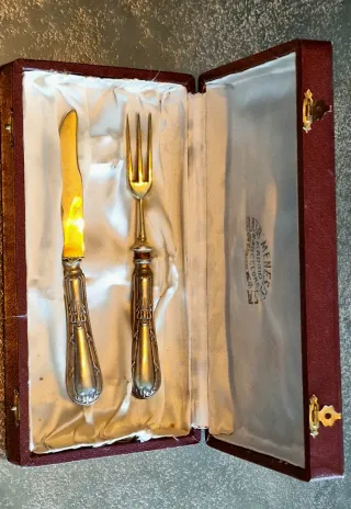 Elegante juego de cubertería de postre, compuesto por cuchillo y tenedor en su estuche