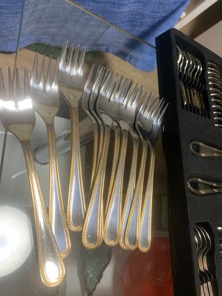 Conjunto de cubertería de metal con detalles dorados. - 7 tenedores de postre.2 cuchara de postre - 5 cucharillas de café.