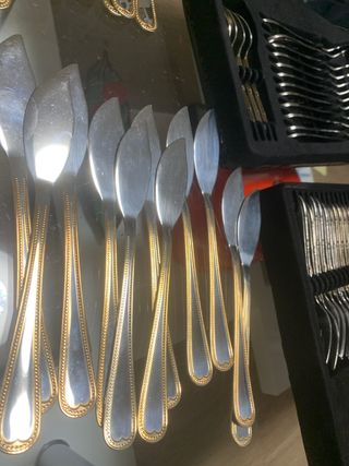 Acero inoxidable 18/10 Cubertería de alta gama a mitad de precio. La vendo por falta de uso. Solo 2 unidades de algunos tipos fueron utilizadas, y muy pocas veces. Los cubiertos se encuentran en muy buen estado. La caja original presenta roturas en algunos puntos, pero no afectan al uso ni a la conservación de los cubiertos. Incluye cubiertos de mesa (cucharas, tenedores y cuchillos) y piezas de servicio. Ideal para familias grandes, celebraciones o como cubertería completa para ocasiones especiales. Es una cubertería de calidad, elegante y duradera, a un precio mucho más bajo que nueva. Precio original: 499 €.