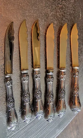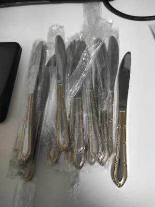 Set de cubertería con un diseño elegante. - 12 cuchillos nuevos sin usar. - 12 tenedores, 8 de ellos con uso. - Acabado en oro y plata.