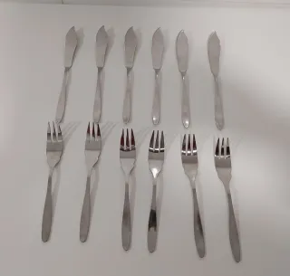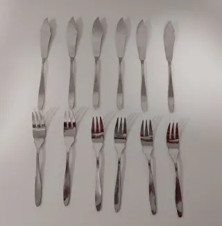 Set de cubertería de pescado de la marca Delta Spain. - Incluye 6 tenedores. - Incluye 6 palas para pescado. - Diseño elegante y funcional. - Acero inoxidable Se puede ampliar a 12 y 12, en este caso el peso sería entre 1 y 2 kg