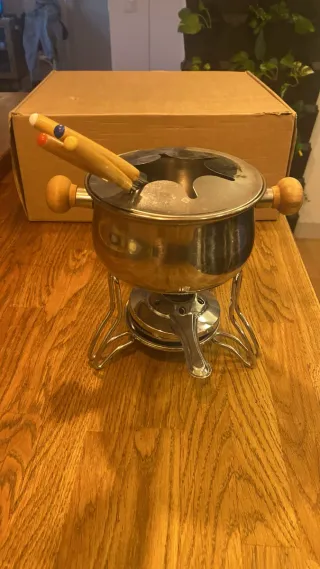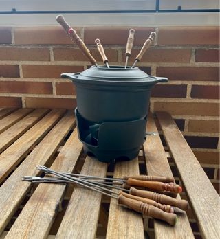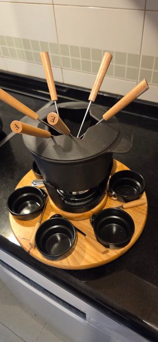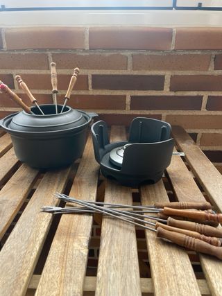 Fondue con olla de hierro fundido y seis tenedores. - Olla de hierro fundido. - Seis tenedores con mango de madera. Tiene un solo uso . Lo vendo por falta de espacio.