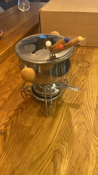 Set de fondue con olla de acero inoxidable y mangos de madera. - Olla de metal pulido. - Base metálica con quemador. - Mangos de madera con detalles de colores. Sin usar