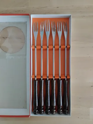 Set de seis tenedores para fondue con mangos de madera y puntas de metal. Utilizados sólo en una ocasión, están nuevos. Regalo el mechero de alcohol 🎁 - Mangos de madera con detalles de color. - Puntas de metal con dos horquillas.