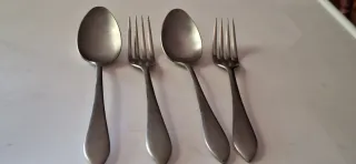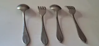 Elegante juego de cubertería de alpaca plateada, ideal para ocasiones especiales. - Incluye 2 tenedores y 2 cucharas. - Diseño clásico con detalles ornamentales en el mango.