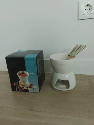 Set completo de fondue de chocolate en cerámica blanca, con diseño elegante y minimalista. Incluye base con espacio para vela tipo tealight, cuenco superior con la palabra “Fondue” grabada y 4 tenedores de acero inoxidable con identificadores de colores. Ideal para chocolate, frutas, postres o para sorprender en cenas y ocasiones especiales. Perfecta también como regalo 🎁 Está nueva, nunca usada y en perfecto estado.