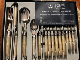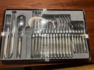 Elegante set de 24 cubiertos de la marca Laguiole, con mangos en color marfil. - Diseño clásico y refinado. - Incluye tenedores, cuchillos y cucharas. 6 cuchillos 6 tenedores 6 tenedores 6 cucharillas - Apto para lavavajillas.