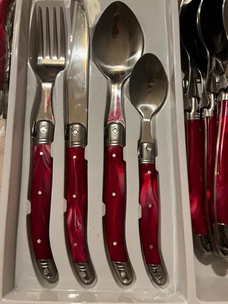 Elegante set de 24 cubiertos de la marca Laguiole Production. Color Rojo - Diseño clásico con mangos de color rojo y detalles plateados. - Fabricados con materiales de calidad para una mayor durabilidad. - Apto para lavavajillas Juego compuesto por - 6 cuchillos - 6 tenedores - 6 cucharas - 6 cucharillas