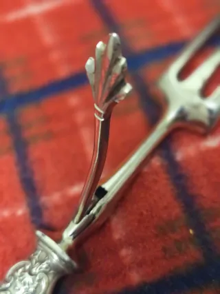 Juego se cucharas y tenedores de marisco y/o pequeños alimentos. De acero inoxidable. Compuesto de: -12 cucharas lisas -12 tenedores con dibujo -12 tenedores lisos Las piezas son de 11 centímetros. Hecho en Japón. Producto como se ve.