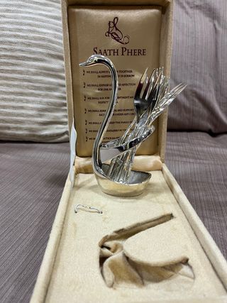 Cisne con tenedores de postre en caja. Varias piezas disponibles. Algunos van grabados y otros sin grabación. Hay algunas piezas oxidadas con el paso del tiempo. Todas están nuevas sin usar.