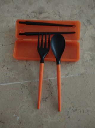 Juego de cubiertos de viaje, ideal para llevar a Japón. Incluye 2 pares de palillos, una cuchara y un tenedor. Son de plástico y presentan un diseño compacto y ligero. Perfectos para llevar en la maleta. - Diseño bicolor naranja y negro. - Compacto y fácil de transportar.