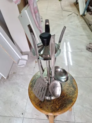 Conjunto de utensilios de cocina: - Espátula ranurada. - Batidor de alambre. - Espátula plana. - Pinzas de cocina. - Espátula para tartas. - Espumadera. - Tenedor para trinchar. - ....... Todo el paquete por 8€