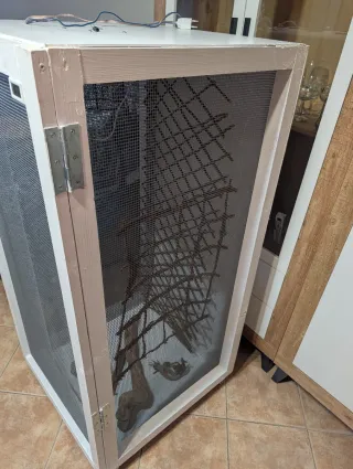 Terrario de malla con diseño de fondo - Estructura metálica. - Paneles de malla para ventilación. - Fondo decorativo con relieve. - Incluye ramas para el interior -sistema de lluvia -pantalla exoterra con bombilla uvb 5.0 usada dos meses - campana para colocar spot de calor *preferiblemente venta en persona*