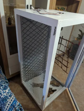 Terrario espacioso y listo para usar, ideal para reptiles o pequeños animales.Solo tiene unos dias de uso, está completamente nuevo y lo vendo con todo, Lampara de luz, Lampara termica, Termostato etc...... - Estructura metálica resistente. - Paneles de malla para ventilación. - Incluye ramas y vegetación artificial.
