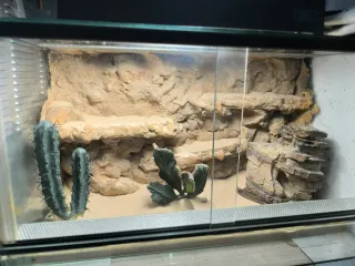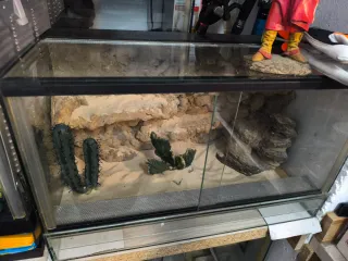 Terrario espacioso, ideal para reptiles. Cuenta con elementos decorativos y de enriquecimiento ambiental. 100€ solo terrario 180€ completo (focos, y decoracion)