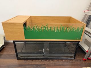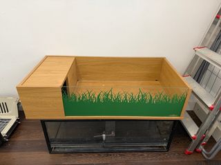 Terrario de madera y cristal, diseñado para tortugas. Cuenta con un diseño moderno y funcional. - Estructura principal de madera clara. - Frontal de cristal con decoración de hierba. - Zona de descanso. - Cristal removible SOLO RECOGIDA EN MANO