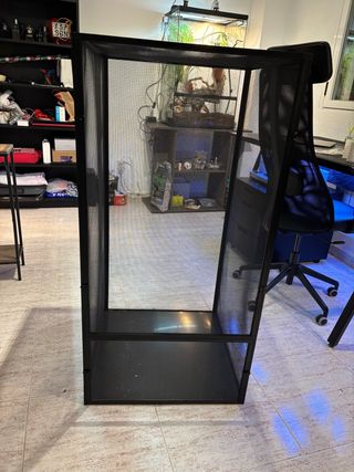 Terrario de cristal con una capacidad de 40 litros. Ideal para reptiles o pequeños animales. - Fabricado en cristal transparente. - Diseño minimlaista y funcional. - Rejilla frontal y superior para ventilación cruzada. La puertecita tiene un desperfecto que se ha limado para que no corte y practicamente no se ve la ponerla en el sitio. Regalo a afectados Dana.