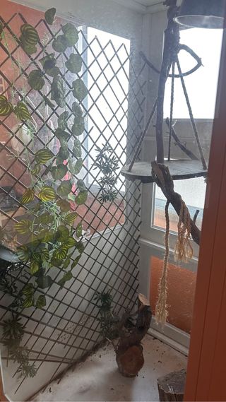 Terrareo vertical casero para camaleon. Medidas 140*140*40. Con fuente, luz, dos focos d calor y sistema d lluvia. Varios maceteros interiores para plantas naturales, lianas y rama d viña. Ademas regalo terrareo pequeño d tienda d cristal. No hago envio, solo recogida, no cabe en un coche.