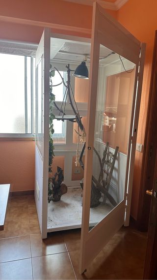 Terrario espacioso con puertas correderas. Mide 1,5 de alto, 1,2 de ancho y tiene 0,72 de fondo. Perfecto para serpientes arborícolas, camaleones o cualquier animal que necesite altura. Aguanta muy bien la humedad y la temperatura, además tiene buena ventilación. - Diseño a medida, hecho a mano. - Puerta de aluminio con llave. - Piscina para beber o bañarse. - La iluminación se mantiene separada para no dañar a los animales. Debido al tamaño y al peso, no se puede enviar por correo. Se puede valorar la entrega en la zona centro de la península.