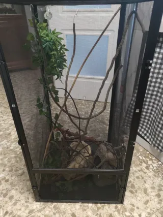 Terrario de cristal de 60x60x45 de profundidad, es desmontable, aunque lo suyo es echarle silicona una vez montado para que se quede mas estable, la parte de arriba es una rejilla metalica, le falta el cristal trasero, cuesta 14€. Tiene dos cristales laterales picados, aunque una vez montado ni se nota, es bastante grande y tiene buena ventilacion tanto para camaleones, lagartos arboricolas o serpientes que trepen, incluyo otra base de terrario y tapa mas accesorios pero sin cristales
