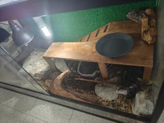 Se vende terrario espacioso para reptiles hecho a mano. Con dos puertas abatibles en la parte superior. Lampara de luz normal incorporada en el techo. Se sostiene sobre dos caballetes que no estan fijos. Estan mordisqueados por El conejo pero cumplen su funcion. Pueden sustituirse por otros facilmente Tiene dos casquillos en cada esquina para lamparas de calor o UV. No incluye accesorios. Tiene bastante uso y presenta desconchones en la madera, de ahi el precio. Solo en persona.
