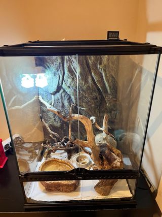 Terrario de cristal Exo Terra con medidas de 60x45x45 cm. Ideal para reptiles y anfibios. Actualmente vive un gecko crestado - Puertas frontales de apertura. - Ventilación superior. - Fondo decorativo rocoso. - dos esterillas de calor una grande y una pequeña - dos ramas naturales una mas grabde otra pequeña -una bañera en forma de roca - una cueva calavera - una cama elevada va con ventosas (actualmente no esta instalada ) - termohigometro -termometro -bombilla en casquillo (no lampara) - gancho extensible (para coger serpiente)