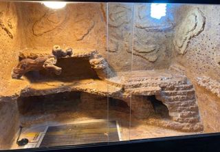 Terrario de madera con fondo rocoso y cuevas ideal para todo tipo de reptiles de clima desértico, echo a mano, instalación eléctrica para dos bombillas, incluye una de calor y otra de uvb 10.0, sistema de ventilación, calefacción (la lámina tiene un pequeño roto, pero funciona perfectamente) tiene varias marcas de uso ya que ha sido el terrario de una Pogona Vitticeps durante muchos años, fácilmente parcheables.