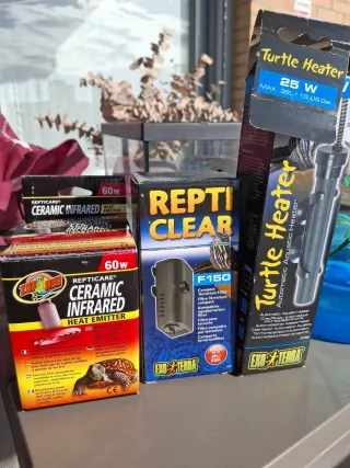 Conjunto para terrario con varios accesorios. Se vende todo junto. Solo vents en persona. - Terrario de cristal con tapa. 40x20x20cm - Filtro interno de agua. - Filtro externo de agua de 4 fases. - Calentador de agua. - Comida para reptiles. - Termómetro digital. - Comedero automatico. - Flexo ExoTerra. - Calcio para tortugas. - Esponja filtrante negra.