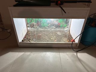 Terrario espacioso para tortugas. Comprado en Kiwoko. Además incluyo lámpara UV con dos bombillas de repuesto incluidas. Calentador de agua digital. Un alimentador automático programable Acondicionador de agua, que poco Liquido limpiador biológico de tortugueros (20€) Comida tortugas . Tiene una pequeña muesca estética en una esquina, que no afecta a la estanqueidad del terrario. Lo vendo porque ya no tengo la tortuga, la tuve que donar el centro de recuperación de animales por qué ya media 30 cm y no tenía espacio. Todo funciona perfectamente