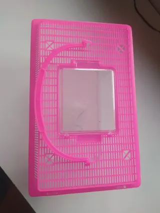 Práctico terrario o pecera con tapa y asa para transportar. - Tapa con rejilla para ventilación. - Asa superior para fácil transporte. - Diseño transparente con detalles en rosa.