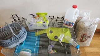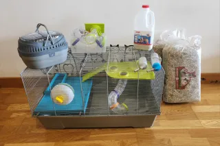 Se vende jaula para hámster con varios accesorios - Incluye transportín. - Rueda de ejercicio. - Bebederos y comederos. - Túneles de plástico para jugar. - Plataformas verdes. - 2 Bolsas grandes de heno. La parte de dentro tiene manchas de desgaste por el tiempo.