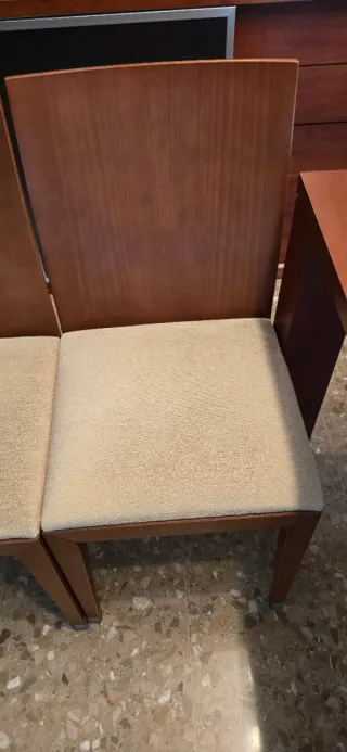 Conjunto de cuatro sillas de comedor con un diseño elegante. - Tapicería en tela color beige. - Estructura de madera en tono marrón. Precio negociable, solo recogida.