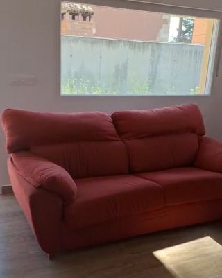 Sofá de tres plazas en color rojo. Disponible otro sofá a juego de dos plazas. - Tapicería de tela. Disponible otro de 2 plazas por 80eu. En venta los dos juntos por 150eu