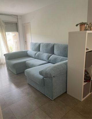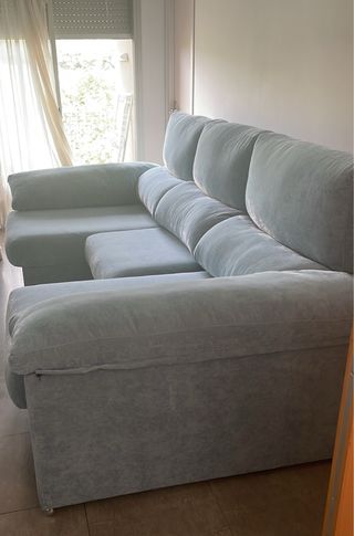 Cómodo sofá chaiselongue hecho a medida. Sofa en forma de U. - Asientos deslizantes de alta densidad con refuerzos. - Doble chaiselonge de 1,60m que se extiende hasta 1,90m. - Tela persa color celeste (repelente al agua, antimanchas, antiarañazos y antipelos). - Brazos de arcon en cada chaiselonge. - Respaldos regulables. - Tapicería suave al tacto. Comprado en Julio de 2024. Medidas: - ancho total 3,20m - largo chaiselonge cerrado 1,60m, abierto 1,90m - largo asiento central cerrado 90cm, abierto 1,50m. - ancho de los asientos 85cm.