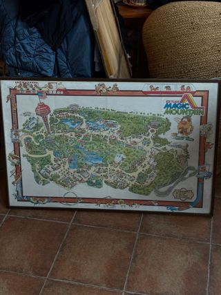 Mapa del parque temático Six Flags Magic Mountain, con marco. - Ilustración detallada del parque. - Marco de madera con diseño decorativo.